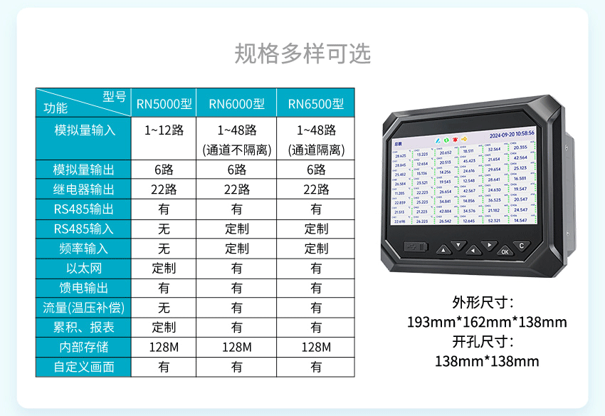 適用場合:本產品為工業無紙記錄儀,配置分辨率為 1024*600 的 7 英寸 TFT真彩全視角液晶顯示屏。可以接入電流、電壓、熱電偶、熱電阻、電阻和頻率(定制)等多種類型工業標準信號,實現溫度、濕度、壓力、液位、流量的顯示、記錄、超限監控、報表、數據通訊、信號變送以及流量累積、流量溫壓補償等功能。可應用于冶金、石油、化工、建材、造紙、電力、食品、制藥、工業水處理等行業。
